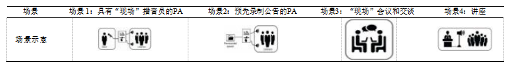 需要STI测试的可能场景有4种,如表3所示,其中确定了传输通道、说话者和收听者。场景1与场景4基本相同,都是测量时说话者通过传声器到扩声系统,再由扬声器系统发声,只是场景1中说话者与听者不在一个房间(场所),而场景4中说话者与听者同在一个房间(场所),所以下面分3种场景进行介绍。在STIPA测试期间,所有的说话者都被STIPA测试信号源所取代,所有的听者(和听者的位置)都是所用STIPA分析仪的测试位置。
